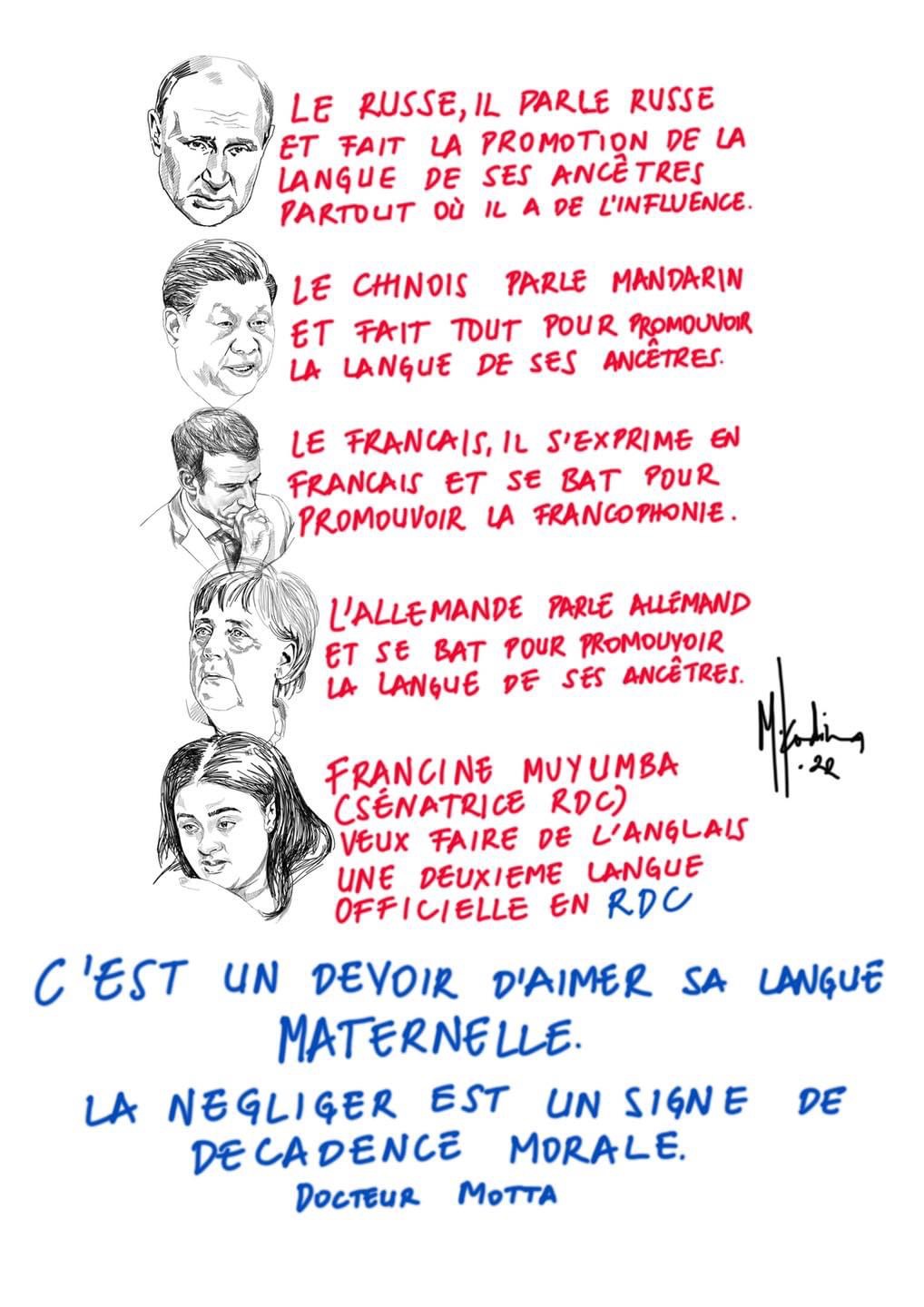 Dans son dessin MKadima reste convaincu que la RDCongo doit plutôt travailler pour la promotion de ses langues maternelles pour devenir une puissance, « C’est un devoir d’aimer sa langue maternelle. La négliger est un signe de décadence morale », cite-t-il docteur Motta.