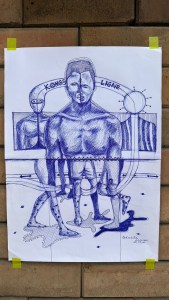 Moi, J’ai cette liberté de m’exprimer que ça soit avec la peinture, les mots, le dessin, etc. Pour cette occasion, j’ai trouvé mieux de créer quelque chose et de réfléchir autour de cette journée. J’ai utilisé la technique du dessin sur papier et réalisé quelques portraits qui représentent sa photo et quelques images qui nous représentent. Nous avons eu des témoignages qu’on a utilisés comme sculpture à l’instar du casque d’un motard qu’on a placé devant l’œuvre qui explique sa réalité avec Kimbangu.