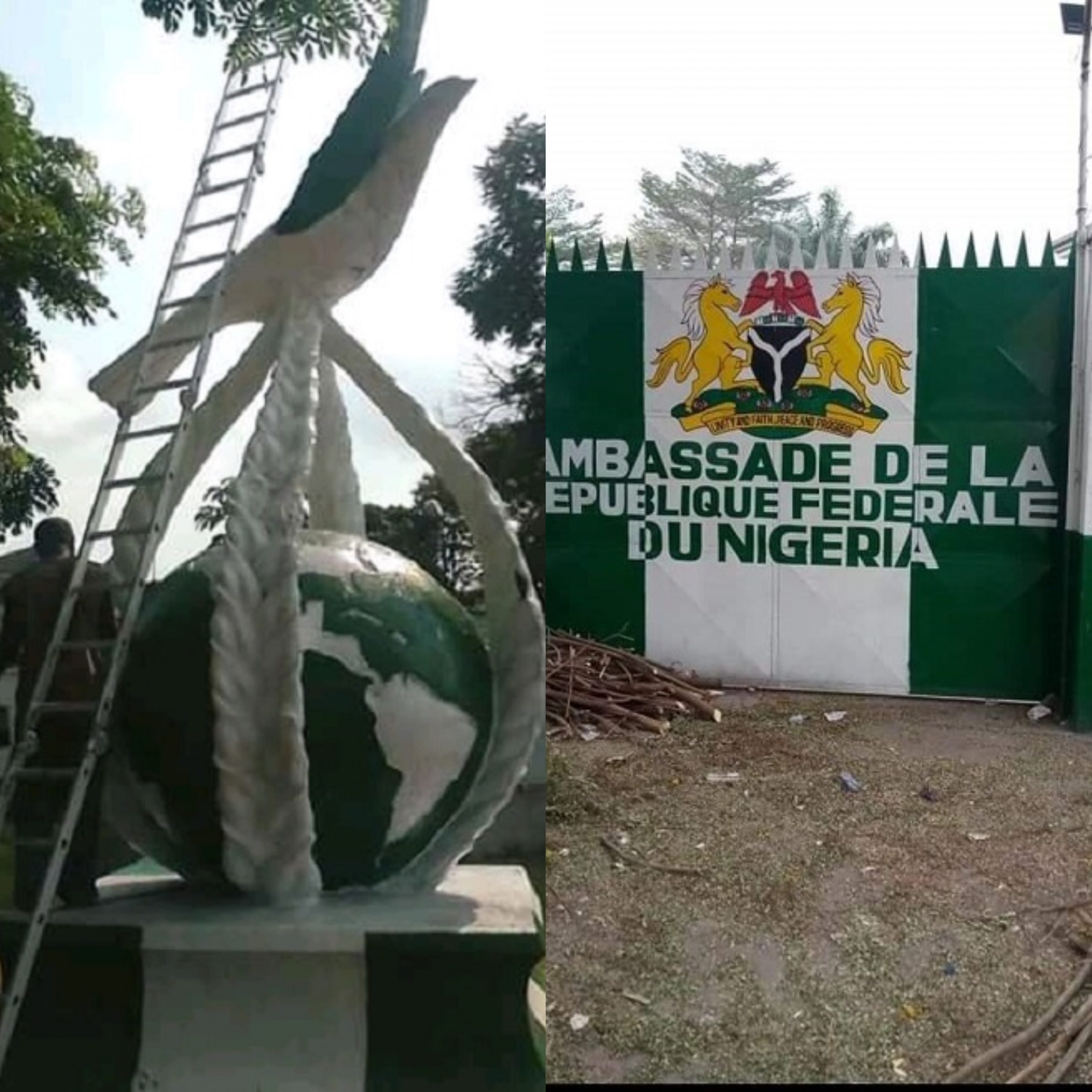 Le forfait a été commis dans la soirée du mercredi 7 octobre par un peintre sous l’œil de deux sujets nigérians sur le symbole du square Mandela. La colombe posée sur les quatre lauriers entourant le globe et son socle, œuvre des frères Meko, Christophe et William, est désormais vert-blanc comme s’il appartenait à l’ambassade du Nigeria située à côté.